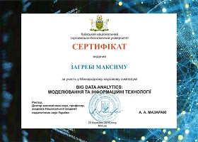 20 березня 2019 року на базі Київського національного торговельно-економічного університету відбувся Міжнародний науковий симпозіум «Big Data Analytics: моделювання та інформаційні технології». У спільному обговоренні проблем і перспектив аналізу великих даних засобами моделювання та інформаційних технологій взяли участь науковці та освітяни, представники бізнесу та громадських організацій. Кафедру економічної теорії, маркетингу та економічної кібернетики представляв доцент Максим Загреба.