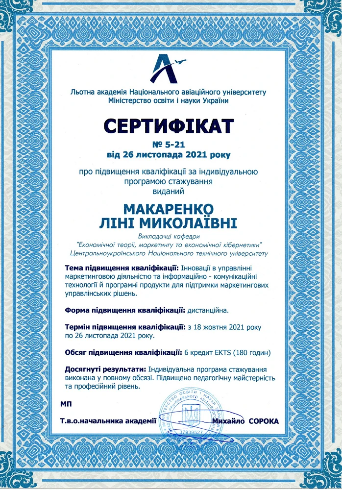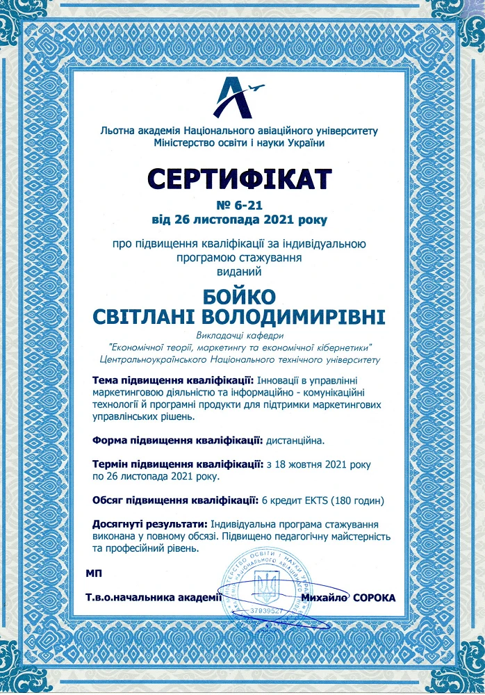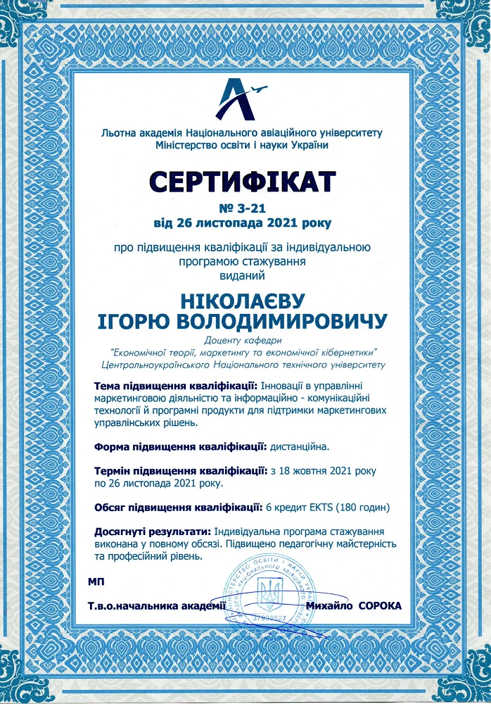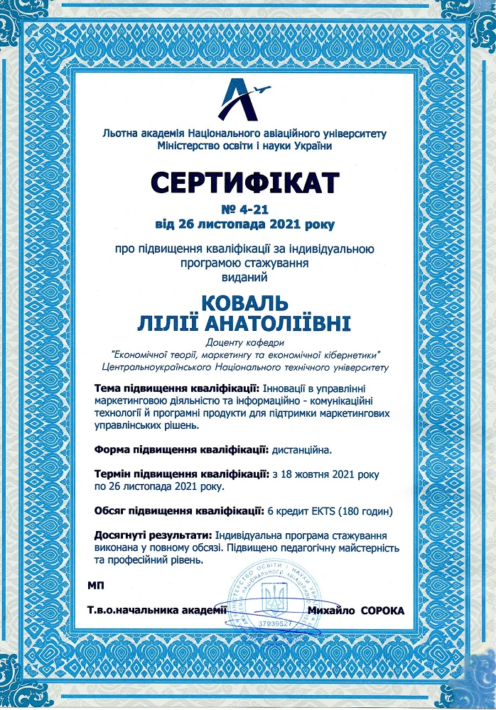 З 18 жовтня по 26 листопада 2021 року на базі кафедри менеджменту та економіки Льотної академії Національного авіаційного університету науково-педагогічні працівники кафедри економічної теорії, маркетингу та економічної кібернетики ЦНТУ – доценти Ігор Ніколаєв та Лілія Коваль, а також викладачі Ліна Макаренко та Світлана Бойко пройшли підвищення кваліфікації за індивідуальними програмами стажування. За підсумками стажування учасники підвищили свою педагогічну майстерність та професійний рівень і отримали сертифікати про підвищення кваліфікації в обсязі 180 годин (6 кредитів ECTS).