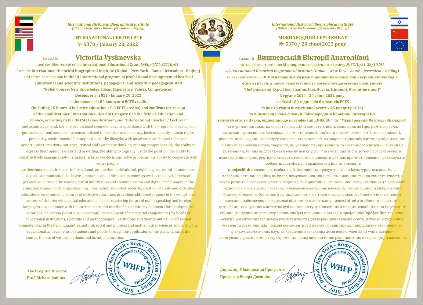 Доцент кафедри Вікторія Вишневська прийняла участь у ІІI Міжнародній програмі підвищення кваліфікації керівників закладів освіти і науки, а також педагогічних та науково-педагогічних працівників “Нобелівський Курс: нові знання, ідеї, досвід, цінності, компетентності” від International Historical Biographical Institute (Dubai – New York – Rome – Jerusalem – Beijing), яка проходила з 3 грудня 2021 р. по 20 січня 2022 р. у дистанційному форматі. За підсумками підвищення кваліфікації учасники отримали міжнародний сертифікат в обсязі 180 годин (6 кредитів ECTS).