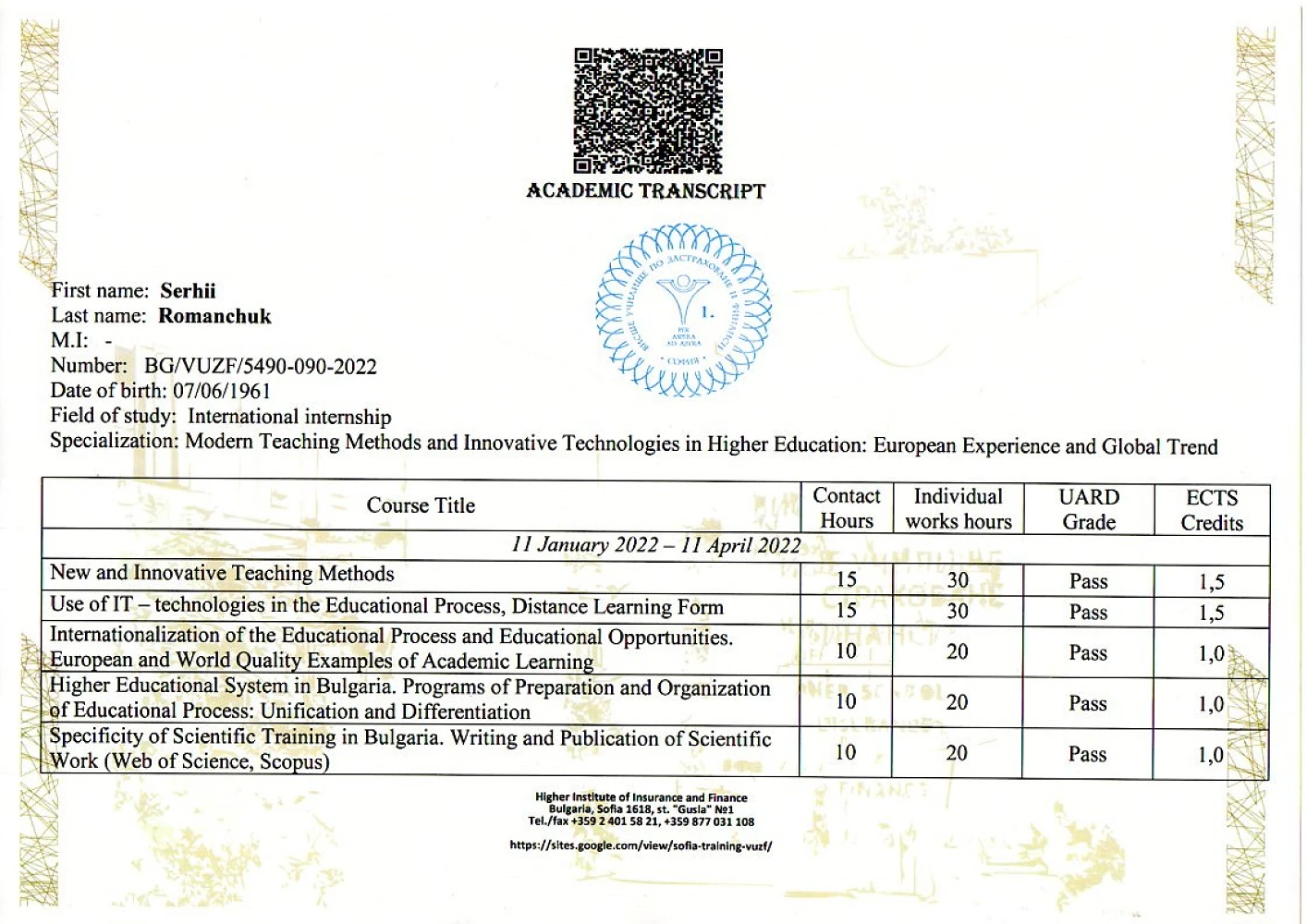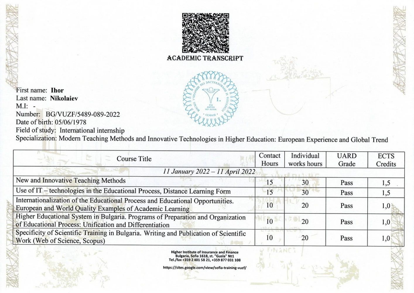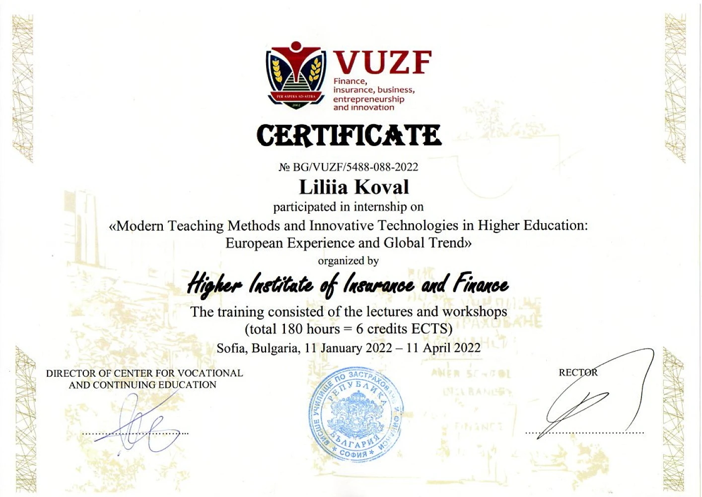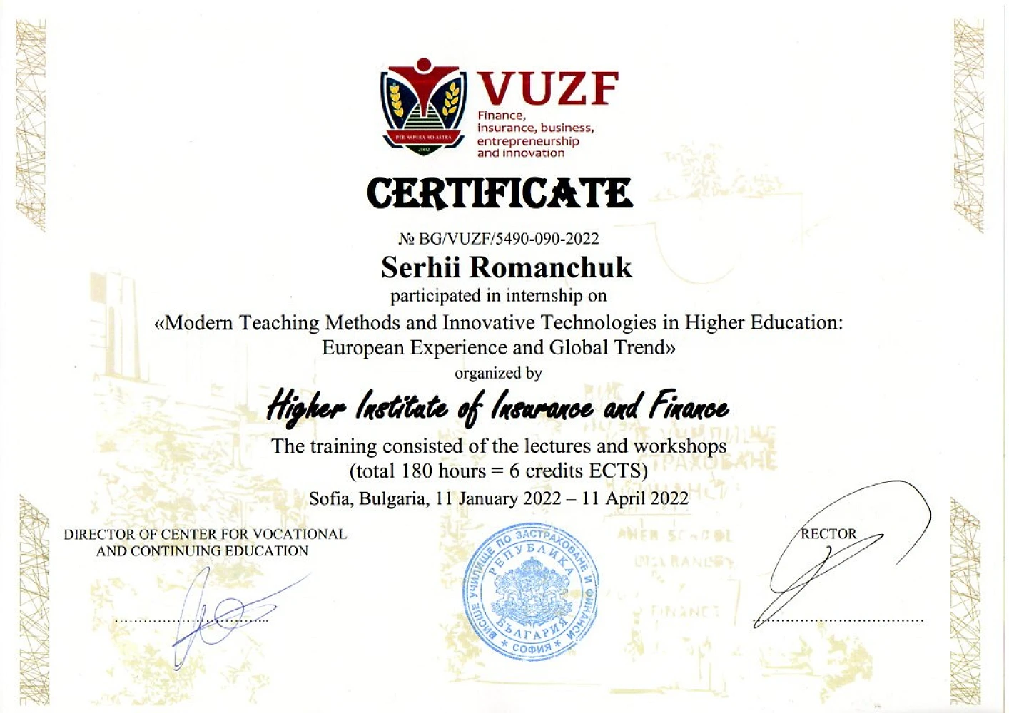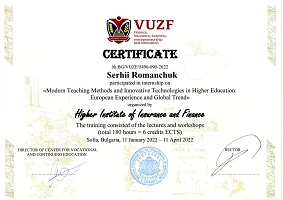 У період з 11 січня по 11 квітня 2022 року відразу четверо викладачів кафедри економічної теорії, маркетингу та економічної кібернетики ЦНТУ – професор Руслана Жовновач, доценти Ігор Ніколаєв, Лілія Коваль та Сергій Романчук дистанційно пройшли міжнародне стажування на базі Університету страхування та фінансів (ВУЗФ, м. Софія, Болгарія) (VUZF University of Finance, Business and Entrepreneurship). За підсумками стажування учасники отримали сертифікати про підвищення кваліфікації в обсязі 180 годин (6 кредитів ECTS).