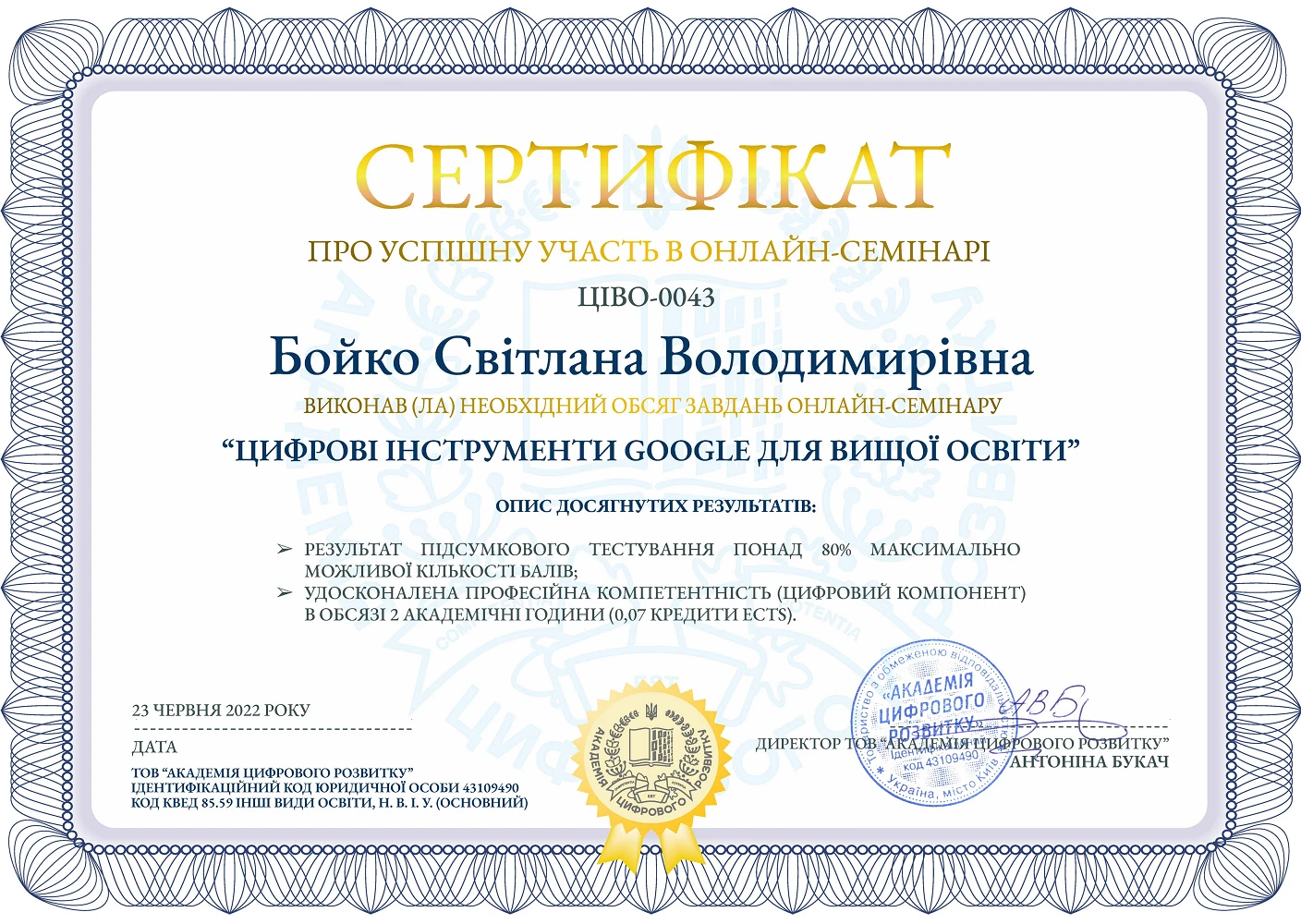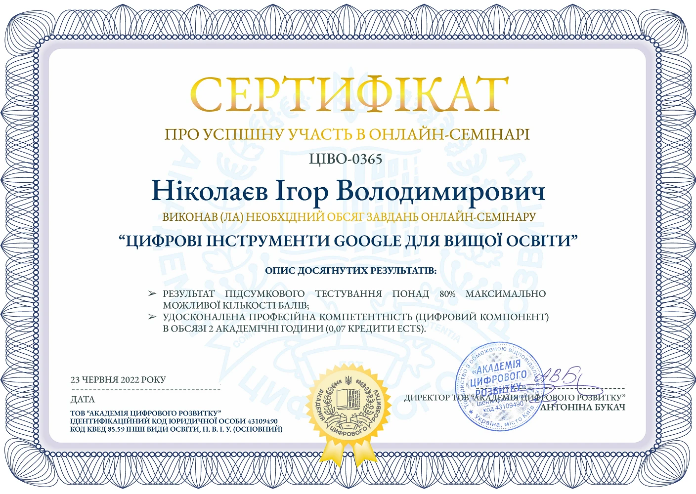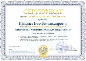 Доцент кафедри економічної теорії, маркетингу та економічної кібернетики ЦНТУ Ігор Ніколаєв та викладач кафедри ЕТМЕК Світлана Бойко 23 червня 2022 року прийняли участь у практичному онлайн-семінарі від Google щодо використання цифрових інструментів для представників вищої та фахової передвищої освіти. Після завершення заходу учасники, що виконали необхідний обсяг завдань отримали сертифікати про успішну участь у онлайн-семінарі в обсязі 2 академічні години (0,07 кредити ECTS).