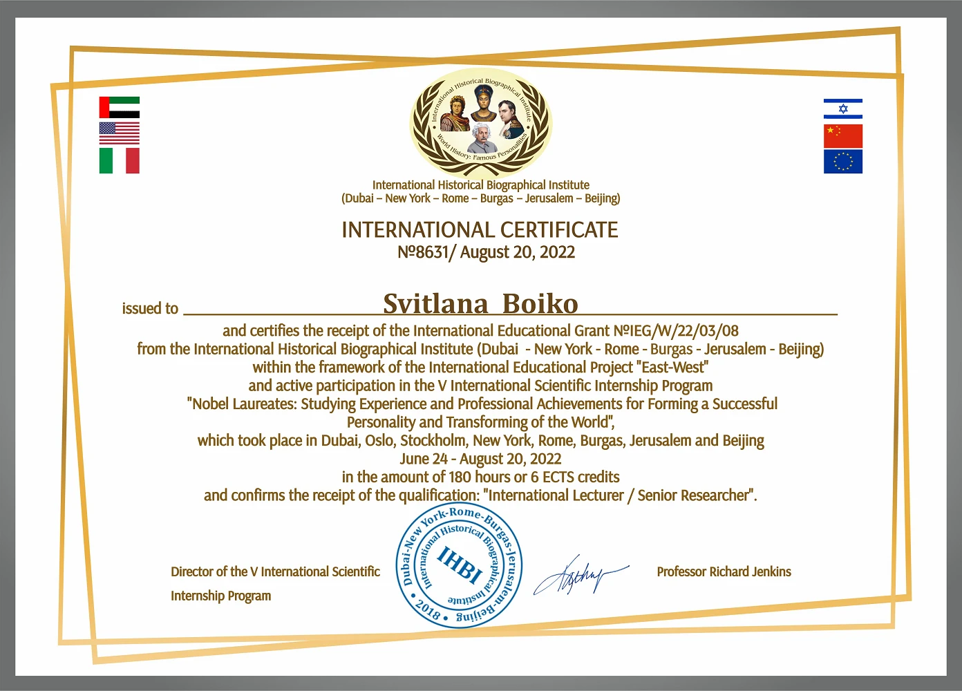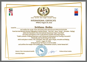 Викладач кафедри Світлана Бойко прийняла участь у V Міжнародній програмі наукового стажування “Нобелівські Лауреати: вивчення досвіду та професійних досягнень для формування успішної особистості та трансформації оточуючого світу“ у Дубаї, Осло, Стокгольмі, Римі, Бургасі, Нью-Йорку, Єрусалимі, Пекіні від International Historical Biographical Institute (Dubai – New York – Rome – Jerusalem – Beijing), яка проходила з 24 червня по 20 серпня 2022 р. у дистанційному форматі. За підсумками наукового стажування учасники отримали міжнародний сертифікат в обсязі 180 годин (6 кредитів ECTS).
