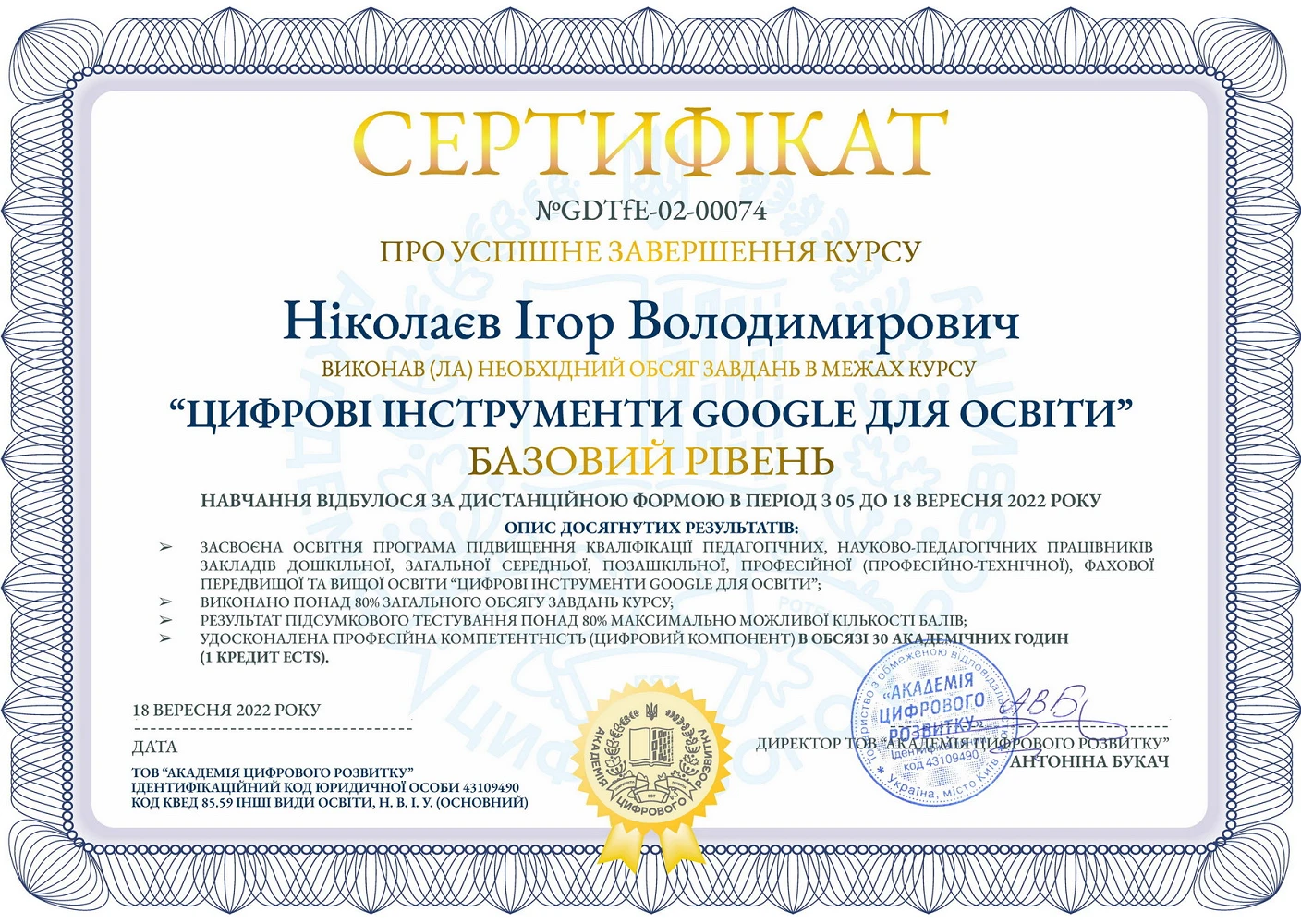 З 5 по 30 вересня 2022 року доцент кафедри економічної теорії, маркетингу та економічної кібернетики ЦНТУ Ігор Ніколаєв прийняв участь у 2-й сесії дистанційного навчання за програмою “Google Digital Tools for Education / Цифрові інструменти Google для освіти”. Організаторами навчання заради розширення можливостей використання цифрових інструментів для організації дистанційного навчання й підвищення ефективності освітнього процесу виступили Міністерство освіти і науки України за підтримки Google Україна.
