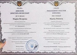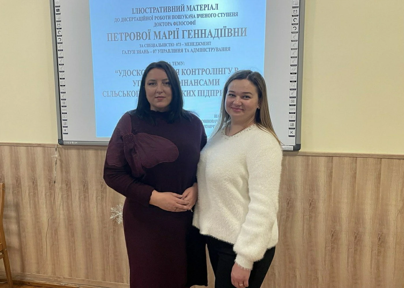 3 листопада 2022 року на засіданні Вченої ради Центральноукраїнського національного технічного університету ректор Володимир Кропівний урочисто привітав і вручив диплом доктора філософії (PhD) за спеціальністю 073 «Менеджмент» Марії Петровій. Захист дисертації на тему «Удосконалення контролінгу в управлінні фінансами сільськогосподарських підприємств» проходив відповідно до вимог нового Порядку присудження ступеня доктора філософії за рішенням разової спеціалізованої вченої ради ДФ 23.073.004 Центральноукраїнського національного технічного університету. Науковий керівник – доктор економічних наук, професор, завідувачка кафедри економічної теорії, маркетингу та економічної кібернетики Руслана Жовновач.