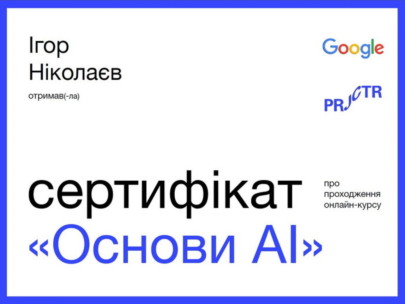 Все що стосується штучного інтелекту зараз знаходиться в тренді та надзвичайно актуально. Головне, що дає штучний інтелект (AI) – це нові можливості для кожного з нас: бізнесу, країни, суспільства загалом. Щоб використовувати ці можливості, потрібно розуміти базову суть технологій AI, принципи роботи та як їх застосувати для власних потреб. Доцент кафедри Ігор Ніколаєв пройшов навчальний курс від Google та Projector Institute “Основи AI” про застосування штучного інтелекту і машинного навчання (ML) для роботи та бізнесу.